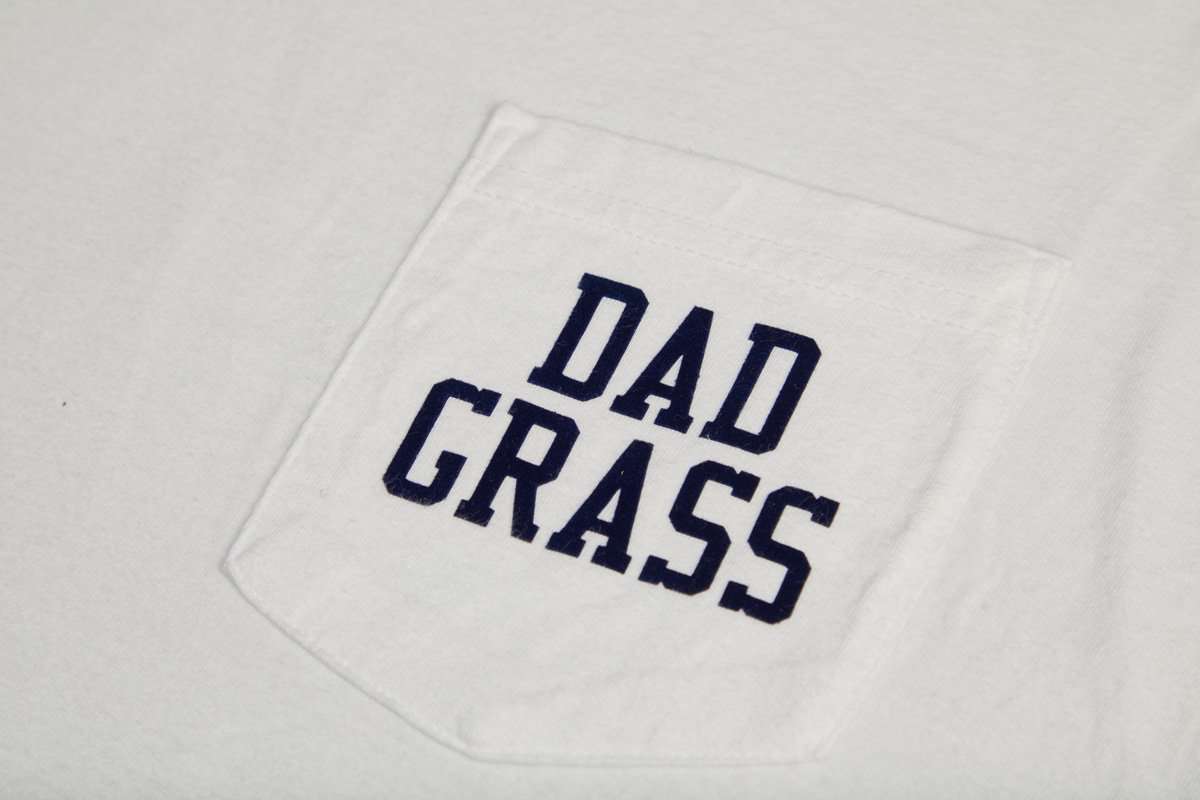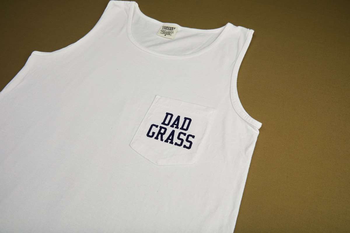 Catch some rays and show the kids you still got it with a pocket-tank that looks as good when mowing the yard as it does taking the neighborhood kids out on the boat. Made from 6.1 oz. soft washed ring spun cotton, it has a left chest pocket and 'Dad Grass' flocked lettering applied by hand at Mark McNairy's house in Los Angeles, California.