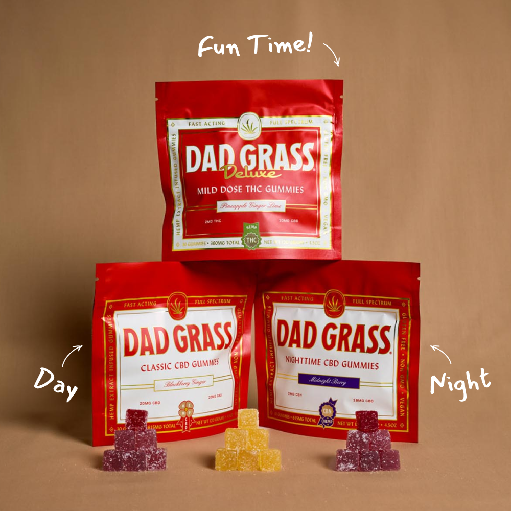 Our Dad Grass Deluxe Gummies are what we call "mild dose." They're pleasantly potent to help you chill to the max. But mellow enough so you can stay in the conversation.