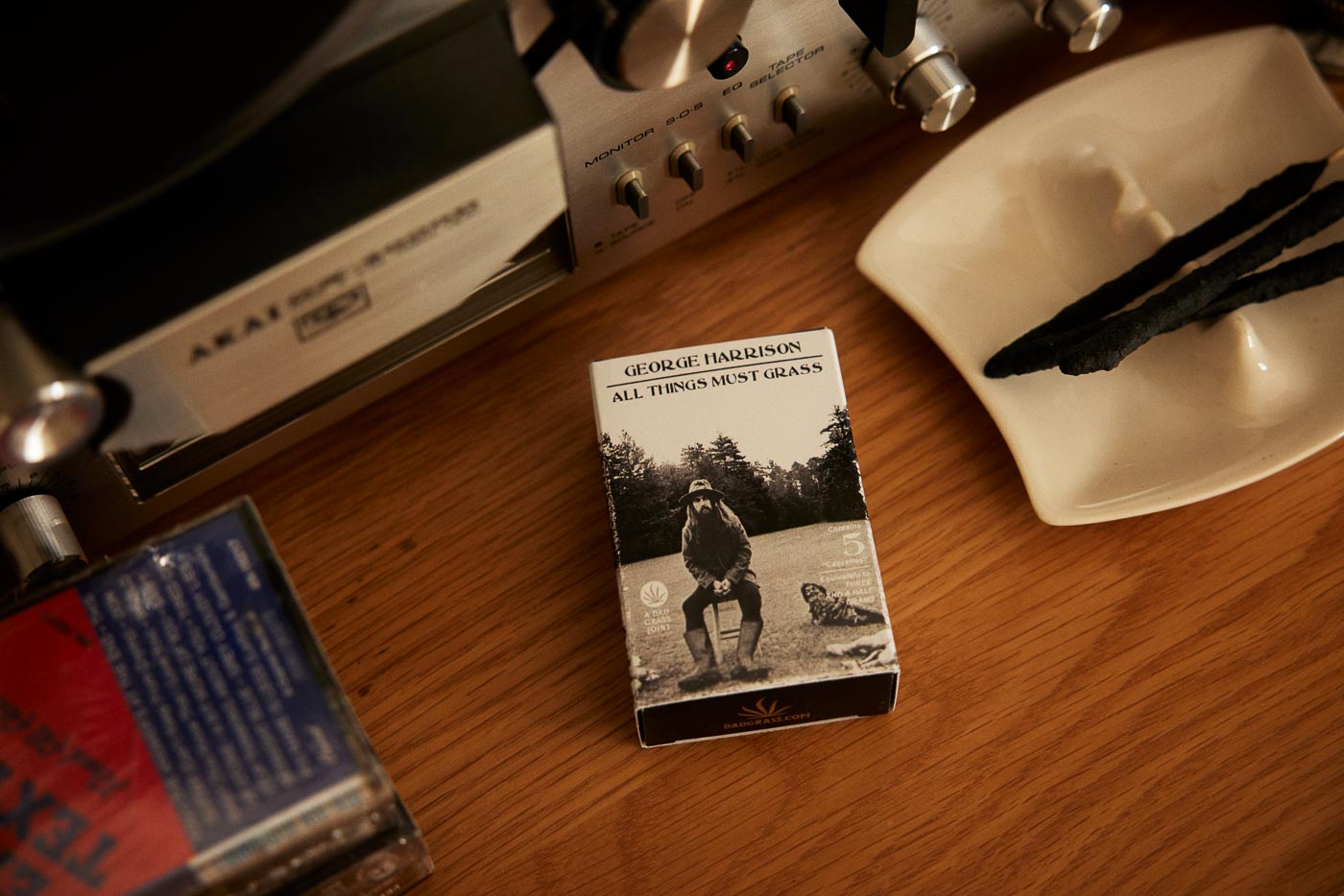 We gave the design of the Special Blend pack a little “extra texture”. How could we resist? We’re mixing it up with George Harrison after all! It’s still the same familiar flip-top hard pack with our E-Z slide insert. But if you look closely you’ll see some tasteful nods to the man and his music. On the front, just below George’s signature, we snuck in one of the gnomes from the cover of All Things Must Pass. On the sides, we proclaim the mantra of the collaboration, “Let It Roll” (an unintentionally apt joint-themed lyric borrowed from George’s Ballad of Sir Frankie Crisp). The batch label, which contains information about the C.B.D and C.B.G concentrations and a QR code for the full testing results, is designed as an ode to George’s time spent in the East. And when you reach for one of your j.oi.nt.s inside, you may just recognize the lush landscape of George’s Friar Park estate, also featured on the cover of All Things Must Pass.