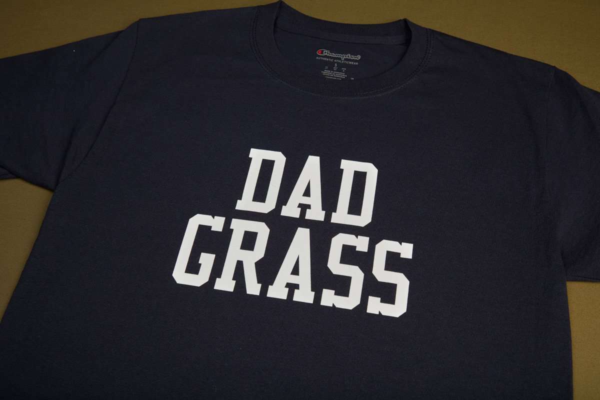 An Update to Our Flagship Dad Grass Logo T-Shirt, First Introduced For Fathers Day 2019. Now on Super Soft Grey and Navy throwback Champion T’s That Will Age Finer Than Wine.