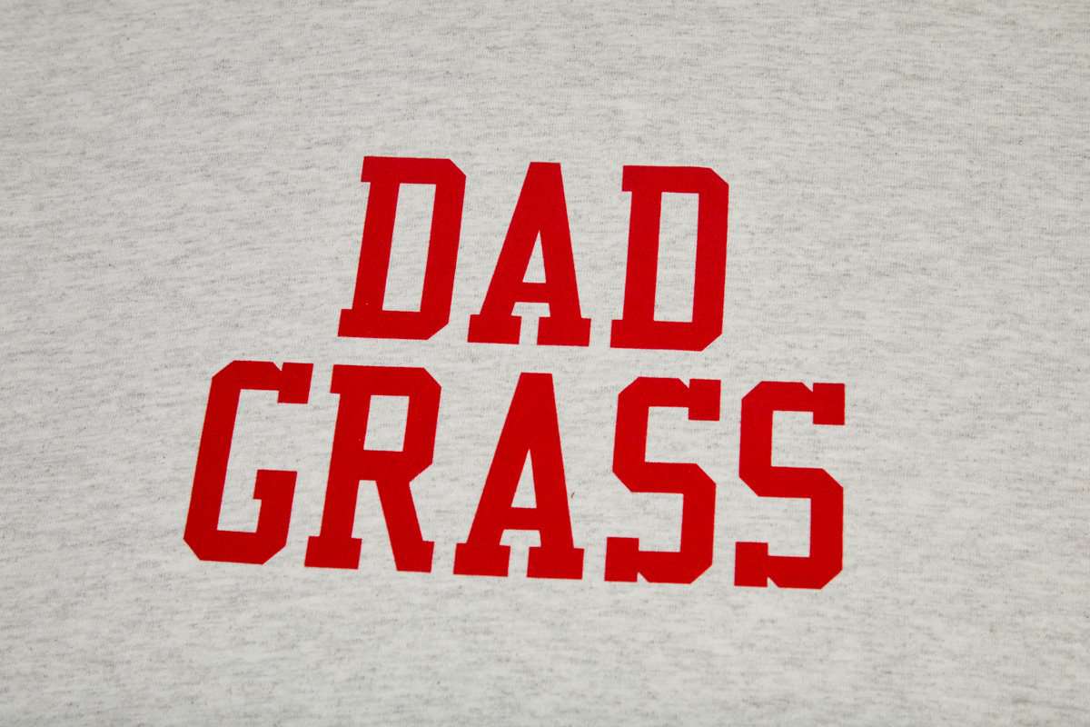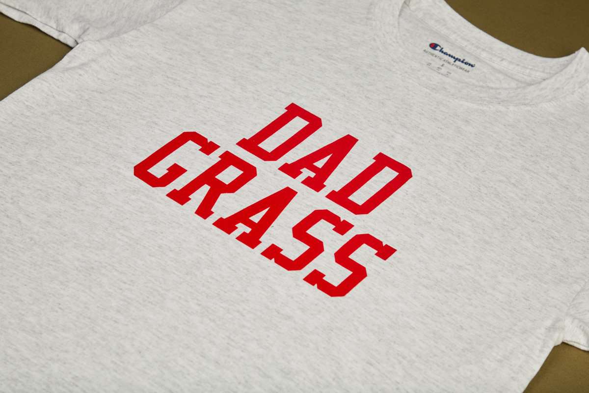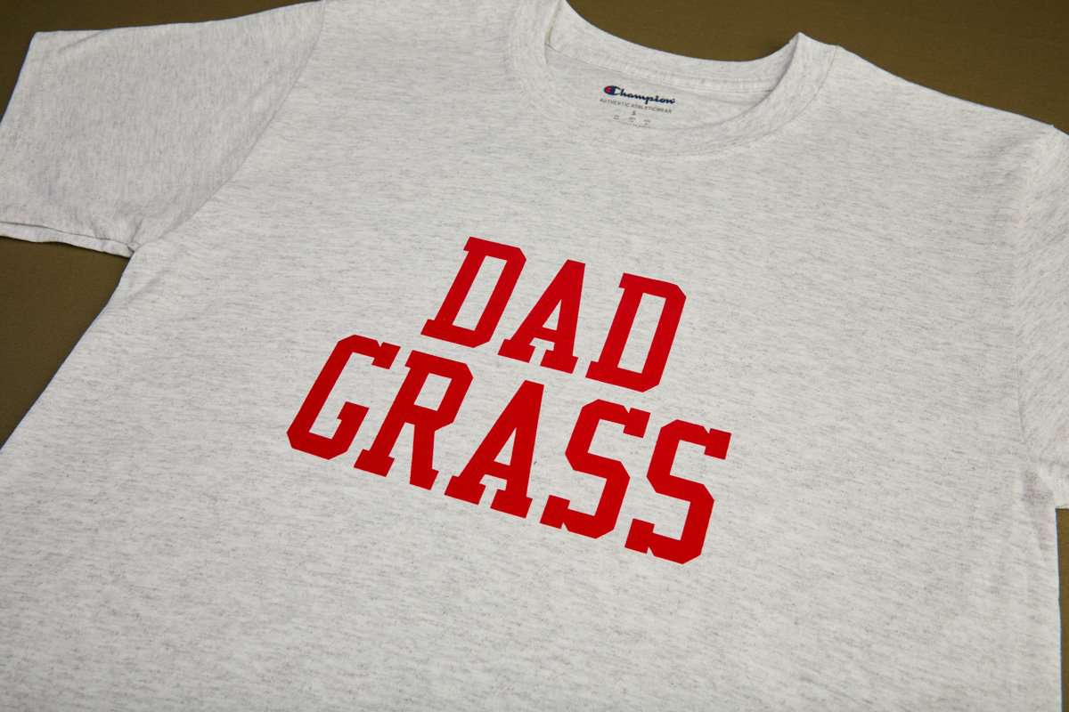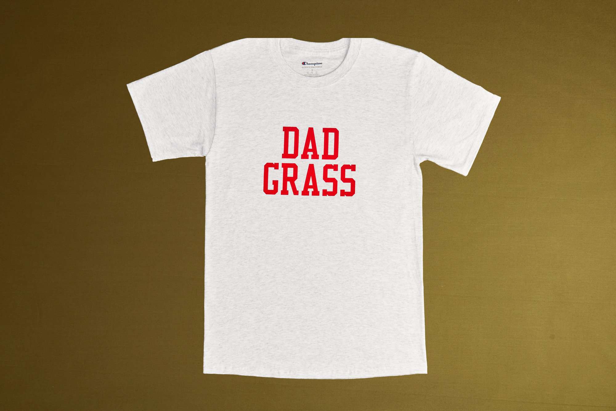 Classic Champion 100% ring-spun combed cotton t-shirt with 'Dad Grass' flocked lettering and artwork, applied by hand at Mark McNairy’s house in Los Angeles.