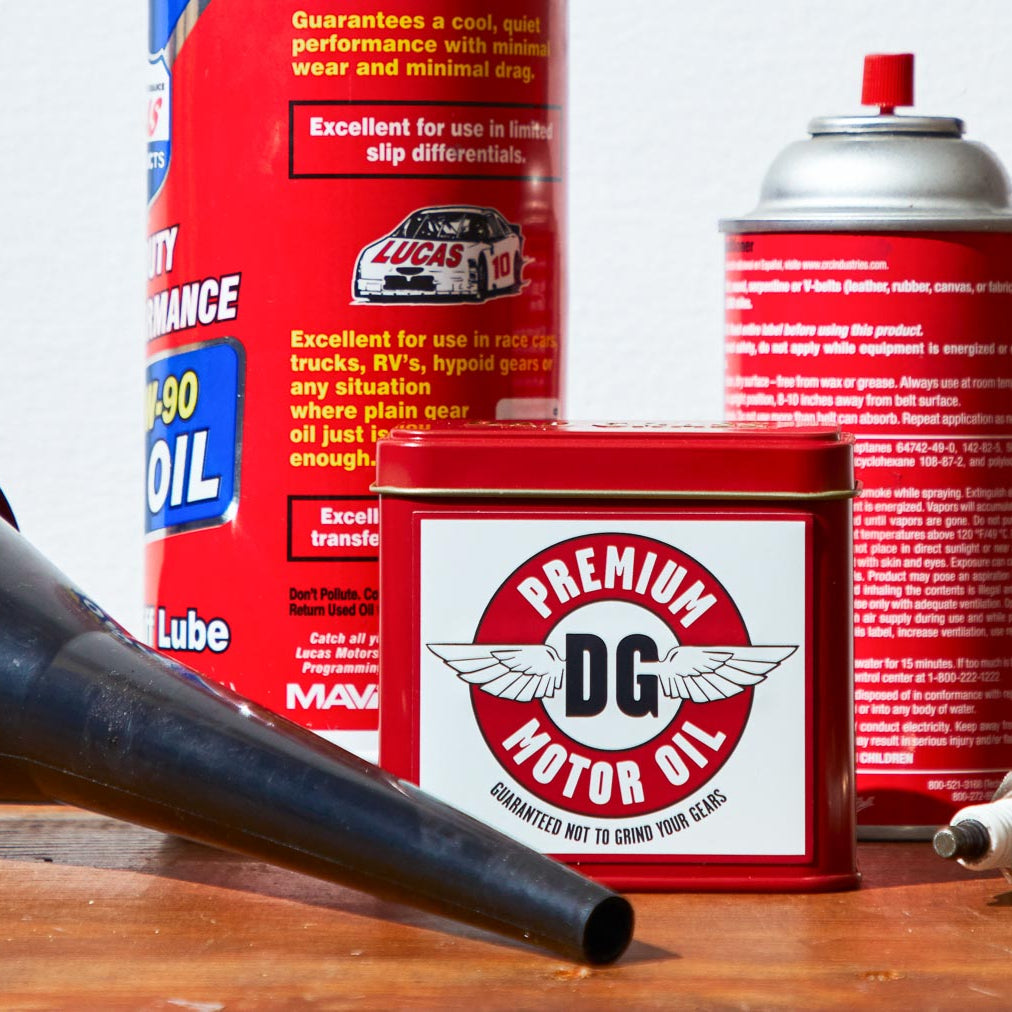 A Quarter or Half Ounce tin of Dad Grass Flower that looks like a can of motor oil, thanks to one of our new Dad Stash decoy magnets, the latest innovation in our revolutionary stashing system.