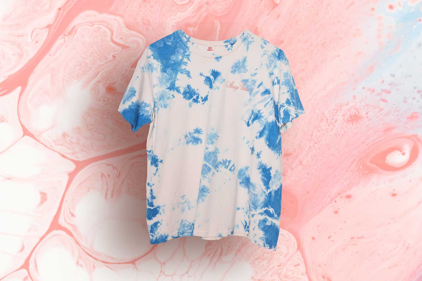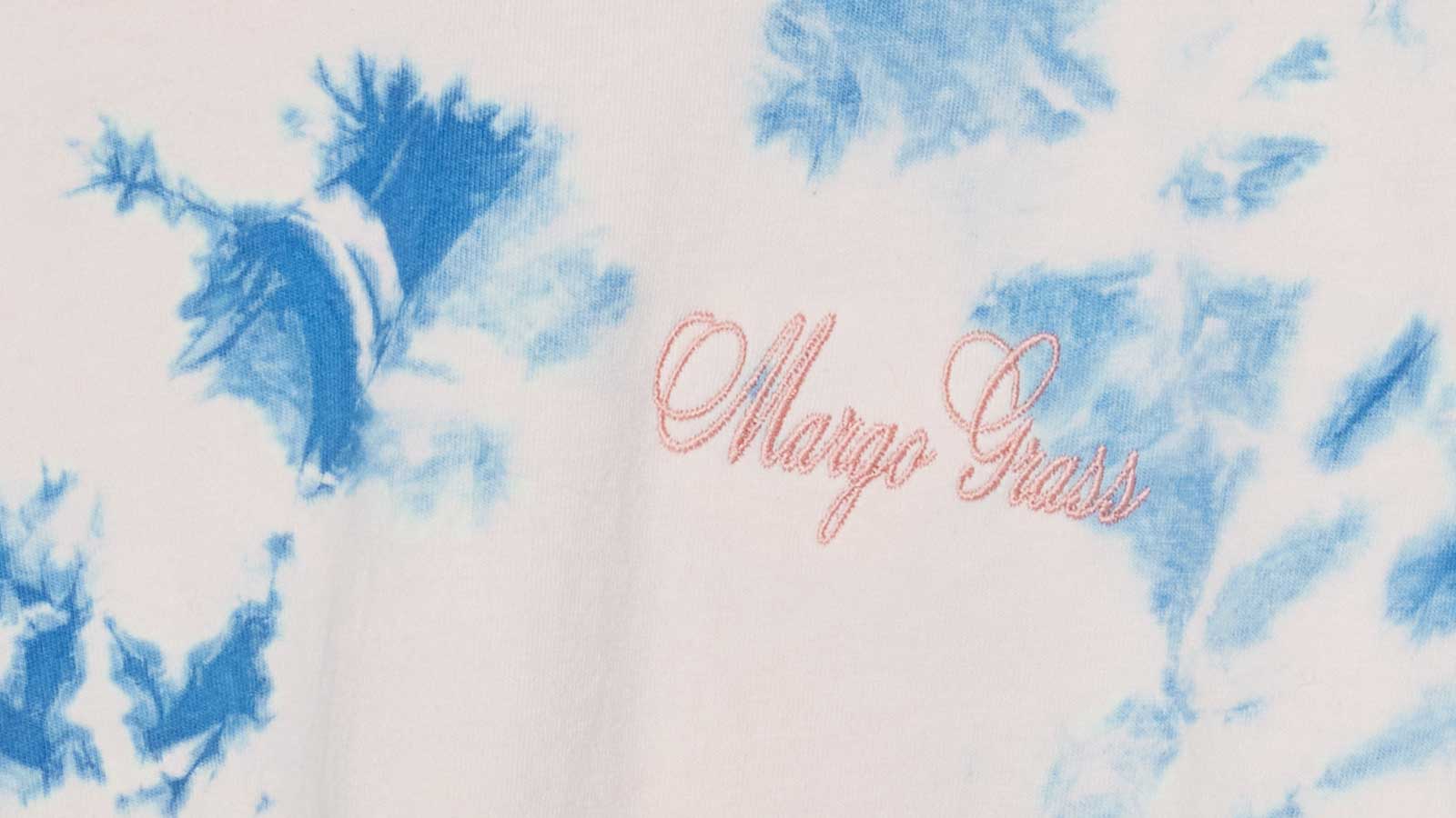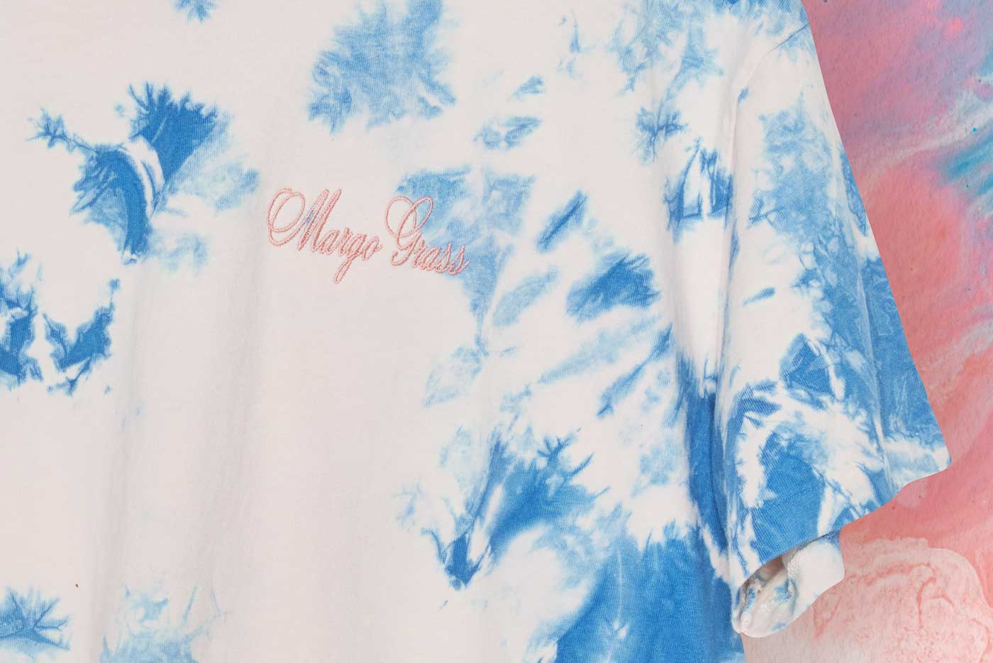 An indigo and light pink tie-dye version of our custom-to-us unisex T-shirt with "Margo Grass" signature embroidered all fancy-like on the front in dusty rose. Limited to a small batch of 50, each one-of-a-kind tee shirt is hand-dyed by Layli Samimi of Layli Dyes Hard in the backyard of her East LA home using natural indigo.