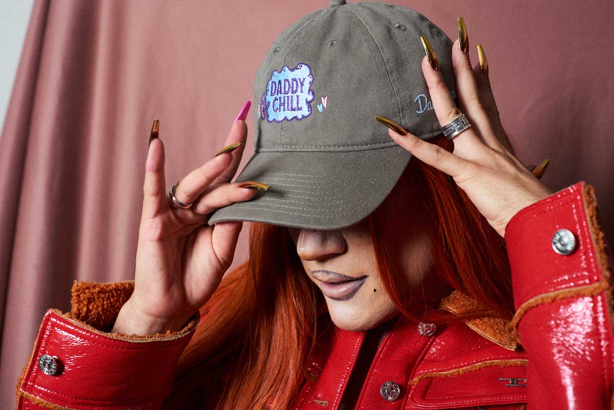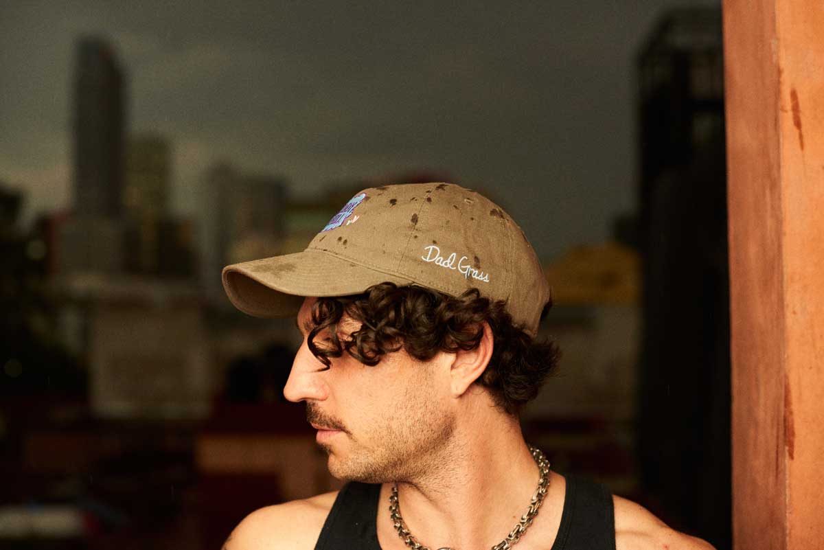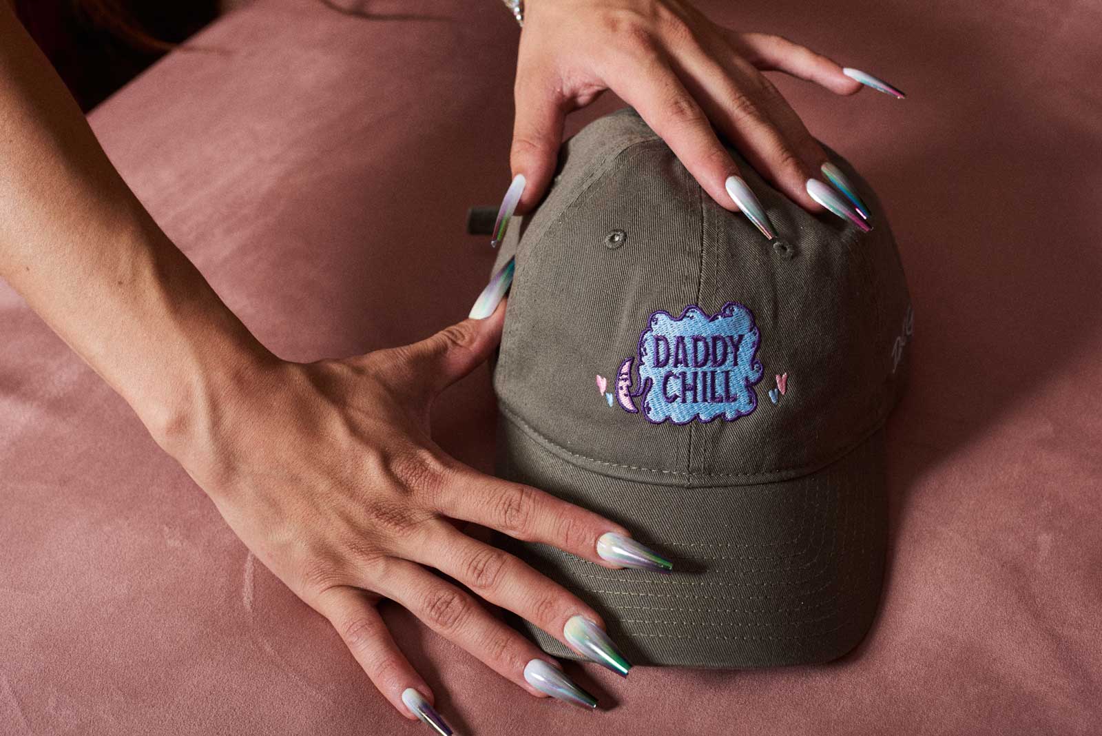 A deconstructed and gender-fluid, classic dad hat made from 100% cotton. On the front is artist Dariush Alexander’s dreamy take on the ‘Daddy Chill’ logo, boldly embroidered and surrounded my love hearts. On the side is Dad Grass embroidered on the side.